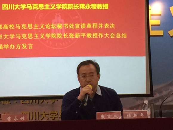 9月24-25日,张新平教授一行参加了在四川大学举行的首届中国西部高校马克思主义论坛,中国西部高校马克思主义论坛是在教育部社会科学司指导下,由浦京线路检测3522登录入口、四川大学浦京线路检测3522、西安交通大学浦京线路检测3522、西南大学浦京线路检测3522发起成立,旨在为西部地区高校搭建一个马克思主义理论学科建设、教育教学、科学研究和理论宣传的交流合作平台。在为期两天的论坛上,与会专家通过主题发言、分组讨论等方式,围绕“浦京线路检测3522建设”、“思想政治理论课课程建设”、“马克思主义理论学科建设”、“多媒体技术的理念与应用创新”等问题展开了深入研讨和交流,在学科建设、教育教学、理论宣传、学院建设、社会服务等诸多方面取得了重要共识。杨宏伟教授主持了第二阶段的大会主题发言。论坛闭幕式上通过了《中国西部高校马克思主义论坛章程》,我校马院同其他三家发起单位一道被推举为论坛理事长单位。最后,张新平教授做了大会总结。大会决定,第二届论坛将于2017年在西南大学举办。2018年,兰大马院将于马克思主义基础本科专业设立30周年、学院成立10周年之际承办第三届论坛。