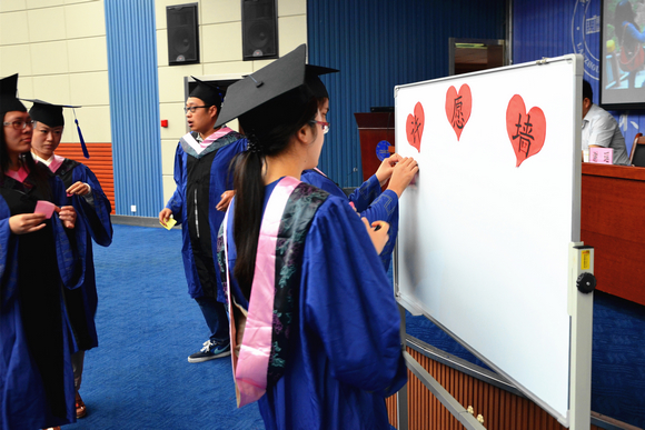 典礼最后,在毕业季的歌声中,2014届全体毕业生在许愿墙上留下自己对母校、学院的心声祝语。前路漫漫且珍惜,心中有爱志更坚,本次毕业典礼伴随着感动与不舍缓缓落下帷幕,全体师生在逸夫科学馆门前合影留念。